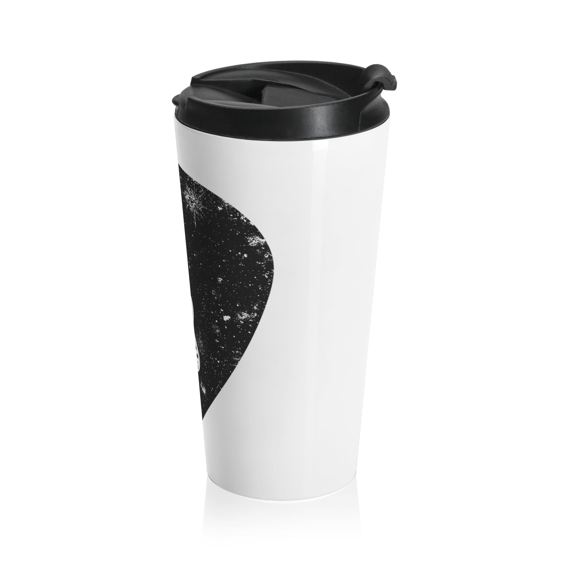 This stainless steel travel mug carries a stripped-back, vintage-rock vibe — a muted black pick-shaped graphic with a white electric bass at its center. It’s built to go loud on the road: the vacuum-insulated body keeps your drink at the right temperature while the screw-on flip lid locks in heat and prevents spills. Lightweight yet sturdy, it slides into cup holders and guitar cases alike, accompanying early morning commutes, late-night rehearsals, and long drives between gigs. The worn, textured artwork feels lived-in, the kind of piece you reach for when you want your beverage and your style to do the talking without shouting.