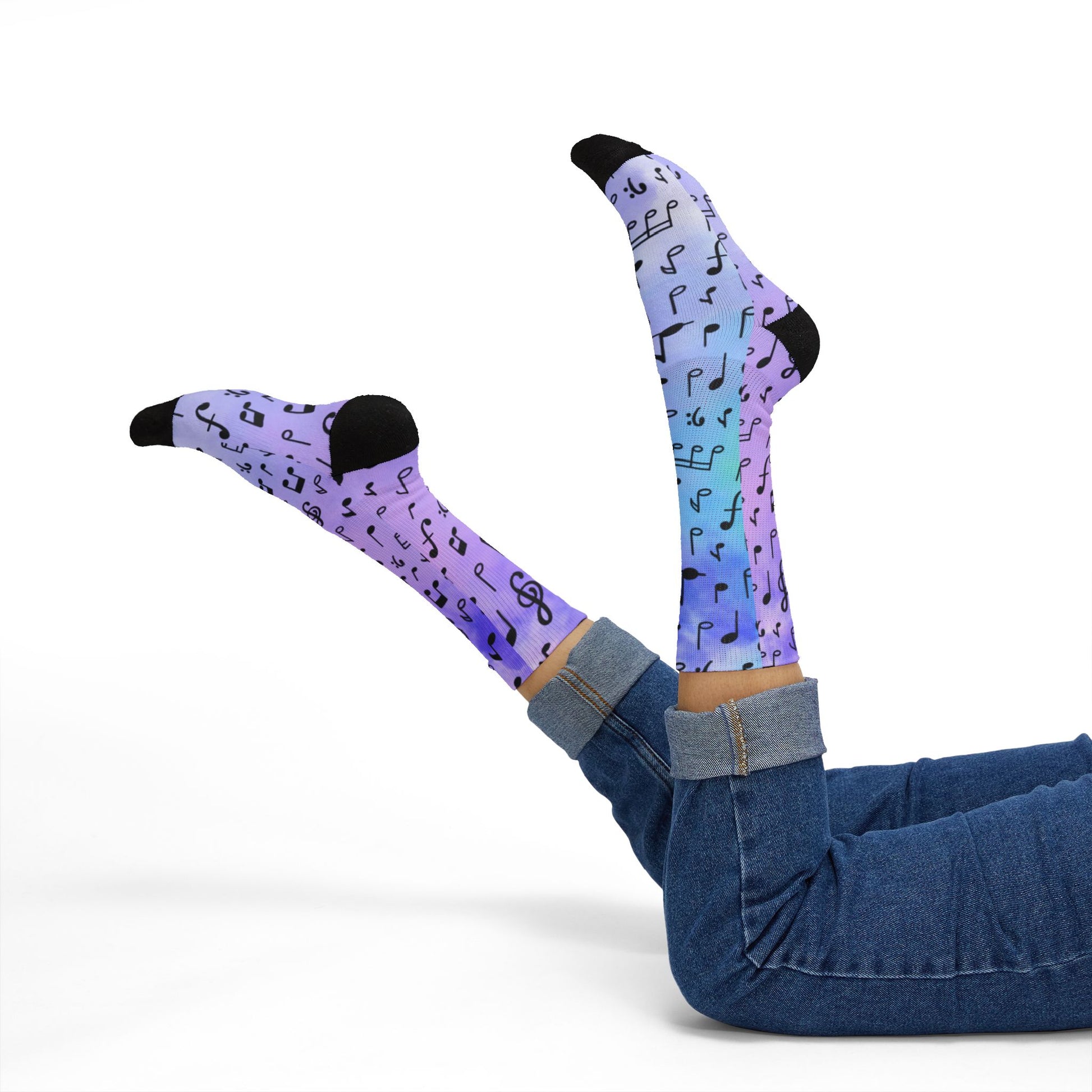 Slip these crew-length socks on and let the music follow you. Soft fleece cushions the sole while the all-over sublimation print wraps notes and clefs in a dreamy purple-blue wash. They sit mid-calf with a supportive ribbed tube and a lightly cushioned bottom so they stay comfortable during long rehearsals, late-night composing sessions, or commuting to the studio. The subtle color gradients and scattered musical symbols read like a private playlist for your feet — playful, creative, and quietly confident.