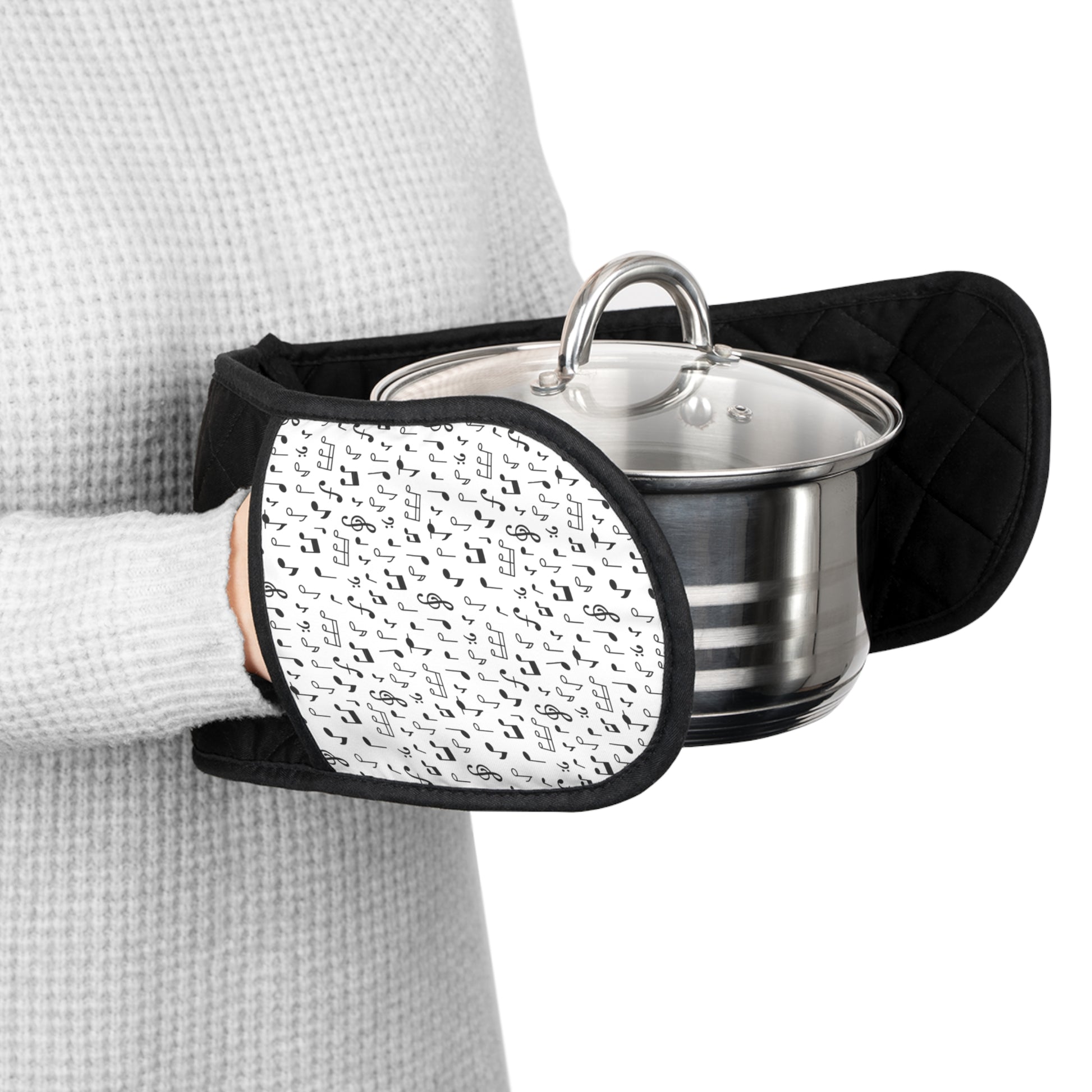 A long, streamlined oven mitt that brings calm confidence to busy kitchens. Padded and quilted where you need it, its black face and patterned ends read as modern and understated. Slip it on to lift a roasting pan, steady the kettle, or transfer a hot dish from oven to table without a second thought. Lightweight and flexible, it moves with your hand so you can grip, turn, and tuck with ease. The hanging loop tucks neatly into life’s routines—hung by the stove, ready the moment heat calls. This is a practical, everyday tool designed for cooks who value clean lines and reliable protection during weeknight dinners and holiday feasts.