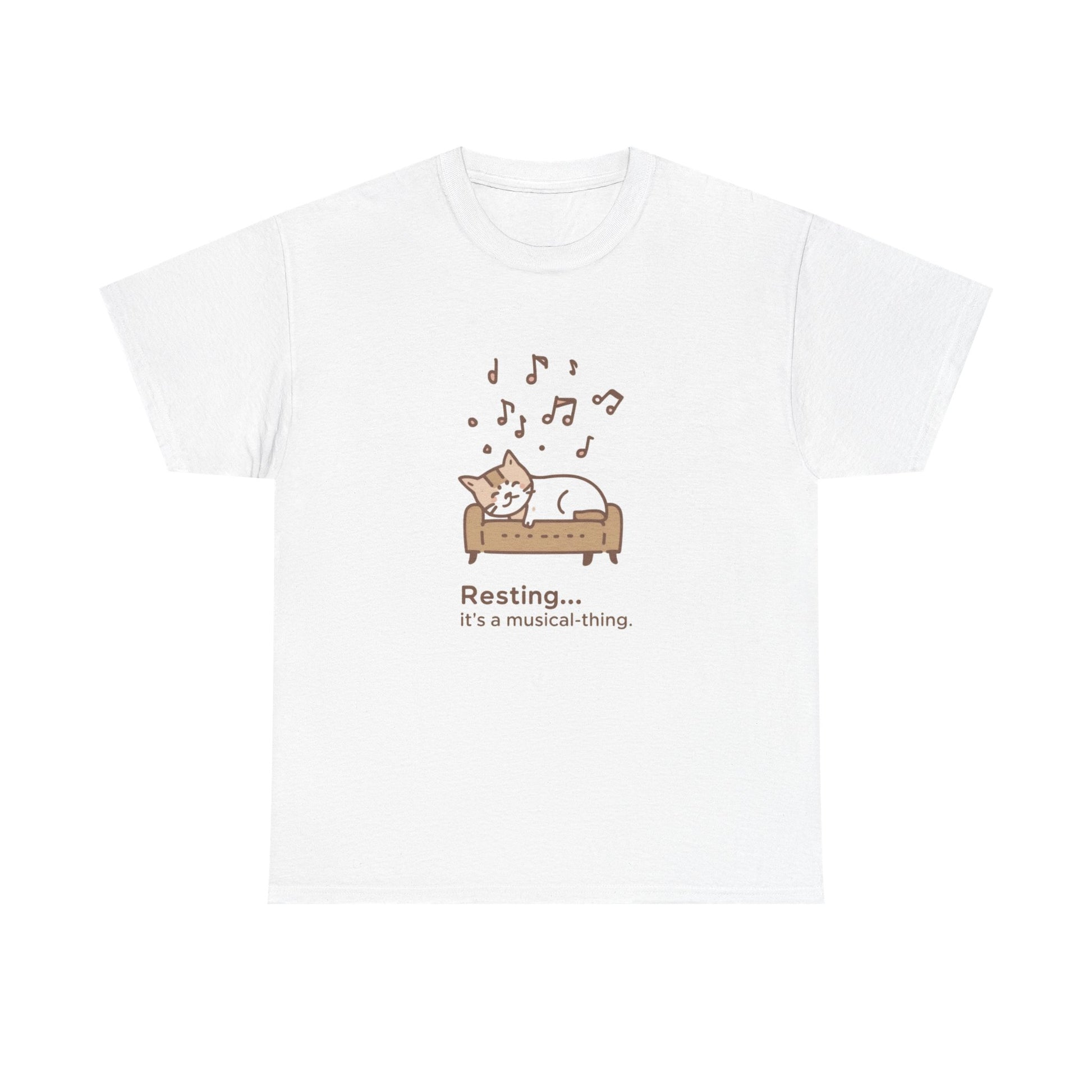 T-Shirt — "Resting... it's a musical thing." Cute Sleeping Cat Music Tee